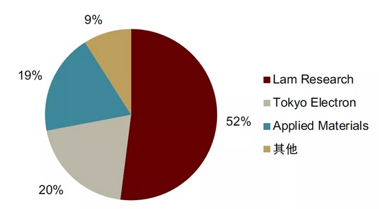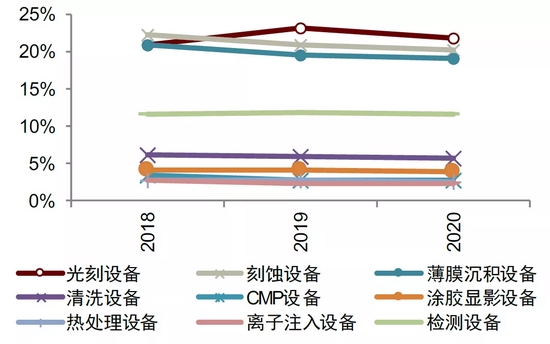 光刻设备、刻蚀设备、薄膜沉积设备是半导体前道设备中最为核心的3类设备。结合SEMI及Gartner数据,我们测算出2020年光刻设备占半导体前道设备价值量21.9%,刻蚀设备占半导体前道设备价值量20.2%,薄膜沉积设备占半导体前道设备价值量19.1%。