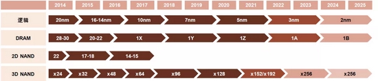 图表:全球半导体行业逻辑器件、存储器件技术演进