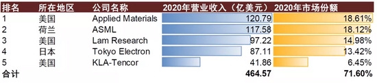 以Applied Materials(应用材料)、ASML(阿斯麦)、Lam Research(泛林半导体)、Tokyo Electron(东京电子)、KLA-Tencor(科磊半导体)为代表的海外半导体设备巨头较早进入市场,拥有深厚的技术积累、稳定的客户关系、领先的市场品牌及雄厚的资金实力等资源,在全球半导体设备市场中占据领先地位。根据Gartner数据,2020年全球前五大半导体设备厂商分别为Applied Materials、ASML、Lam Research、Tokyo Electron及KLA-Tencor,对应市场份额分别为18.61%、18.12%、14.98%、13.42%及6.45%,销售额合计达464.57亿美元,占市场总额的71.60%,形成较高的行业集中度。
