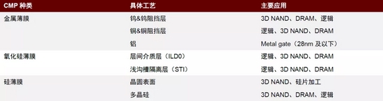 按薄膜种类分,主要分为金属薄膜、氧化硅薄膜及硅薄膜三大类CMP技术,应用于逻辑、DRAM及NAND芯片的制备过程。