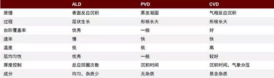 ► 原子层沉积(ALD):是一种可以将物质以单原子膜形式一层一层的镀在基底表面的方法。原子层沉积与普通的化学沉积有相似之处。但在原子层沉积过程中,新一层原子膜的化学反应是直接与之前一层相关联的,使这种方式每次反应只沉积一层原子。ALD设备沉积的薄膜具有非常精确的膜厚控制和非常优越的台阶覆盖率,对于多维结构体表面精确成膜需求具有不可替代的应用。基于此,在28nm以下关键尺寸缩小的双曝光工艺方面取得了越来越广泛的应用。