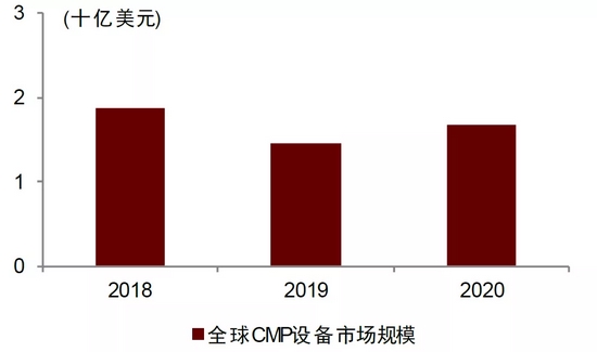 根据Gartner数据,2020年全球CMP设备市场规模为16亿美元。目前全球CMP设备市场主要由海外厂商占据,Applied Materials和Ebara的全球市占率合计超过90%,14nm以下先进制程生产线上所应用的CMP设备更是仅由这两家国际巨头提供。国产设备厂商方面,主要有华海清科,目前公司产品已进入国内主流晶圆厂商供应链。