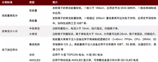 离子注入设备按照能量高低可以分为低能量/高能量,按照束流大小可以分为中低束流/大束流。常用的生产型离子注入机主要有三种:低能大束流离子注入机、高能离子注入机和中低束离子注入机,其中低能大束流离子注入机和高能离子注入机制造技术难度相对更高。