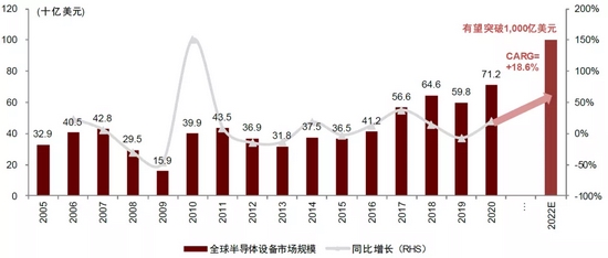 根据SEMI数据,2020年全球半导体设备市场规模为712亿美元,全球半导体前道设备市场规模为612亿美元。我们看到全球半导体行业2H20开始由于芯片缺货,各厂商加大资本开支,行业重新进入上行周期。SEMI预计2021/2022年全球半导体设备市场规模有望达到953/1,013亿美元,其中前道设备市场规模为817/869亿美元。