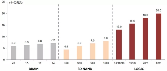 根据Tokyo Electron预计,随着逻辑代工从14/16nm向5nm先进制程发展,设备投资金额有望由130亿美元增长54%至200亿美元;而3D NAND随着堆叠层数增长所需设备投资额同样增长迅速,相比48层,128层NAND设备投资额有望增长82%至80亿美元,主要来自刻蚀设备需求的提升;DRAM相较NAND与逻辑设备投资额随技术提升相对平缓,1Z制程所需设备投资额将达到72亿美元,相比2Z制程的59亿美元提升22%。