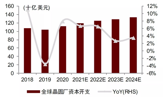 根据SEMI,2020年全球晶圆厂商资本开支1069亿美元,SEMI预计2024年全球半导体晶圆厂商资本开支有望达到1276亿美元,其中:中芯国际2021年CAPEX 43亿美元;华虹半导体2021年CAPEX 13亿美元;台积电2021年CAPEX 300亿美元;联电2021年CAPEX 15亿美元;世界先进2021年CAPEX 2亿美元。
