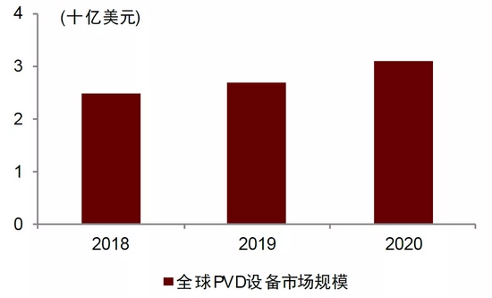根据Gartner数据,2020年全球CVD设备(包含ALD设备)市场规模为84.2亿美元,全球PVD设备市场规模为30.9亿美元。根据Gartner数据,2020年Applied Materials占据全球CVD设备市场份额28%,占主导地位,Lam Research和Tokyo Electron紧随其后。国内企业中北方华创的LPCVD、拓荆科技的PECVD已经通过国内主流晶圆厂验证,开始出货销售。根据Gartner数据,2020年Applied Materials占据全球PVD设备市场份额86%,市场集中度较高。国内企业北方华创占比2%,公司28nm氮化钛硬掩膜(Hardmask PVD)、Al-Pad PVD设备已进入国内主流12英寸晶圆厂商供应链。
