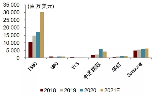 图表:2018-2021E全球主要晶圆厂CAPEX