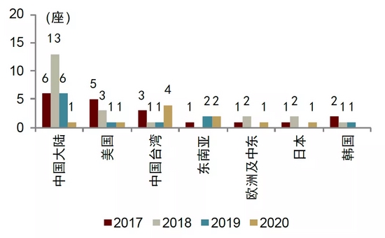 图表:2017-2020年全球新建与开始运营晶圆产线占比(按地域拆分)