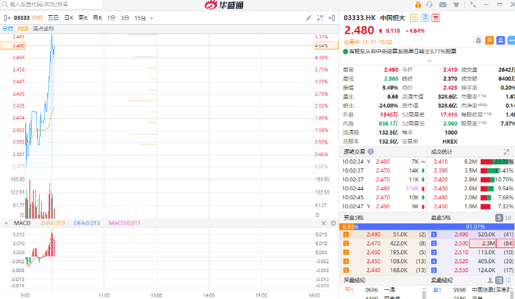 华盛资讯11月11日消息,截至发稿,中国恒大涨4.64%,报2.48港元每股,成交额6400万港元,最新总市值328.6亿港元。