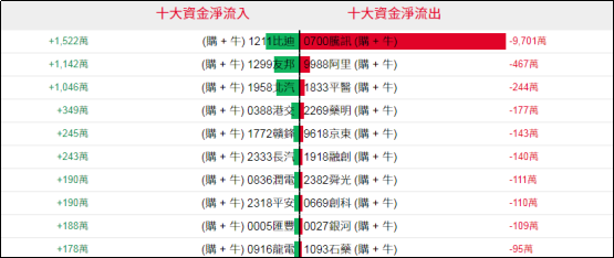 好仓(认购证及牛证)方面,周三比迪相关好仓单日录得约1,522万港元资金净流入,友邦、北汽等相关好仓单日亦录得逾千万资金净流入;相反,腾讯相关好仓单日录得约9,701万港元资金净流出,阿里、平医等相关好仓单日亦录得部分资金净流出。