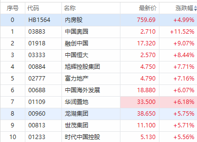 华盛资讯11月11日消息,港股内房股涨幅居前,中国奥园涨超11%,融创中国涨超9%,中国恒大涨超8%,旭辉控股集团、富力地产涨超7%。