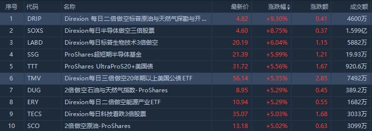 其他ETF方面,每日二倍做空标普原油与天然气ETF $DRIP 涨9.30%,成交额4600万美元;2倍做空石油与天然气指数ETF $DUG 涨5.29%,成交额389.2万美元。