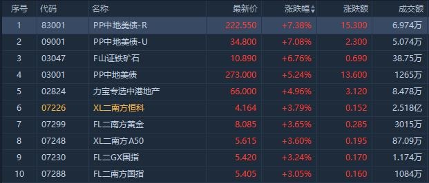 从ETF涨幅榜来看,涨幅位居前的是PP中地美债ETF $03001.HK 涨5.24%,成交额1265万港元;力宝专选中港地产ETF $02824.HK 涨4.96%;南方两倍看多黄金ETF $07299.HK 涨3.65%,成交额3015万港元。