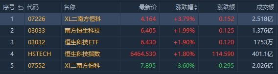 南方两倍做多恒科 $07226.HK 涨3.79%,成交额为2.518亿港元;