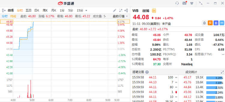 11月11日消息,美股盘前,领先社交媒体微博公司今日公布截至2021年9月30日的第三季度未经审计的财务报告。财报公布后,微博盘前涨超6%。