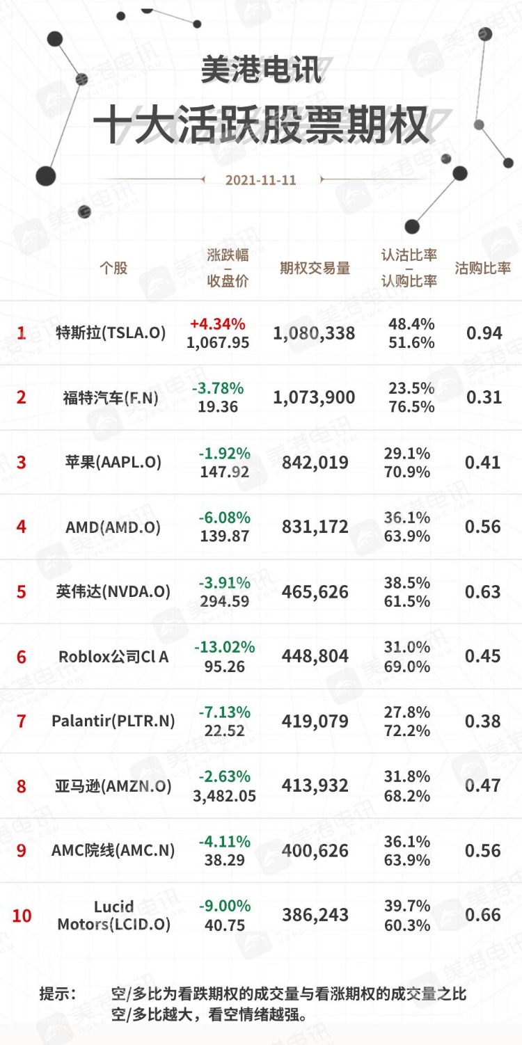 隔夜福特汽车(F)期权交易量从上一交易日的81.8万张涨至107.4万张,AMD(AMD)期权交易量从上一交易日的79万张涨至83万张。
