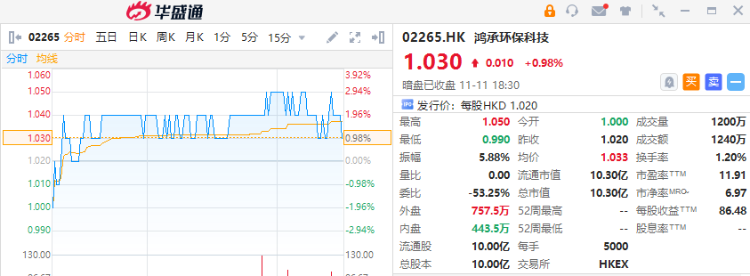 华盛资讯11月11日讯,金矿危废处理企业鸿承环保科技 $02265.HK 暗盘低开1.96%,尾盘收涨0.98%,最新总市值10.30亿港元。该股预计将于明日(11.12)正式上市。
