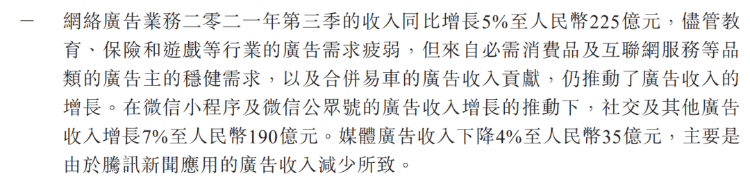 假如说游戏业务只是缺少爆发力,腾讯的广告业务就显得很疲软了。第三季度的广告收入同比增长5%,其中社交广告增长7%至190亿元,而媒体广告收入下降4%至35亿元,财报给出的原因是腾讯新闻应用的广告减少导致。