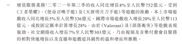 1、增值业务收入同比增长8%至人民币752亿元,其中国内市场游戏收入同比增长5%至336亿元,国际市场收入同比增长20%至113亿元,略低于分析师预期;