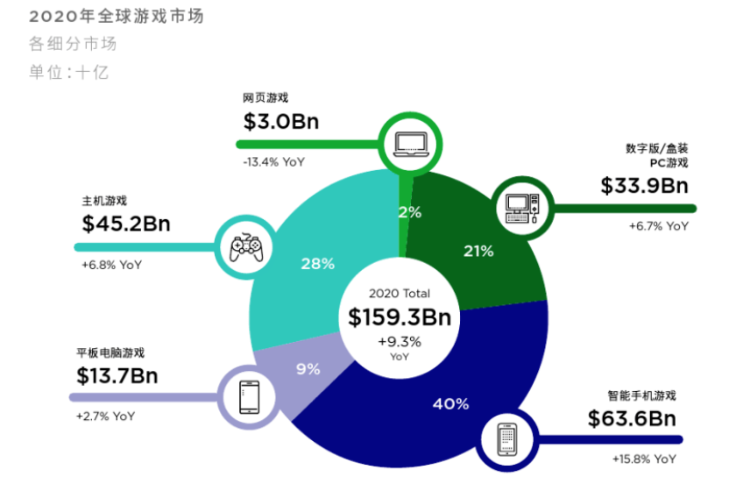 游戏业务方面,空间其实是有的。根据Newzoo发布的统计,2020年全球游戏市场规模是1593亿美元,其中手游和网游合计1142亿美元。