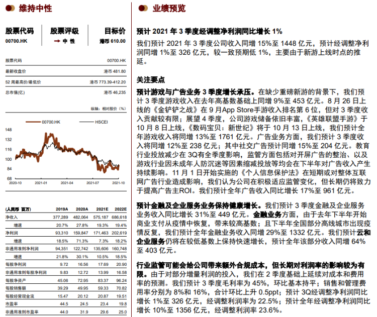 比如中金之前发布的研报就预测,三季度腾讯收入为1448亿元,同比增长15%,经调整净利润326亿元,同比增长1%。