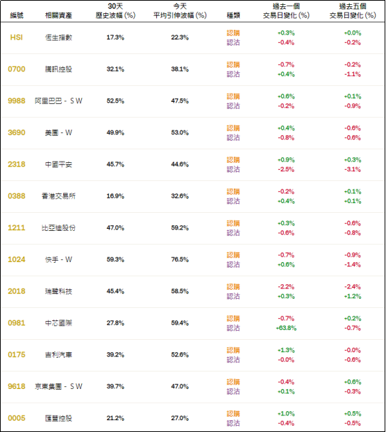 周四恒指相关权证的平均引伸波幅约22.3%,按日略有调升。个股方面,腾讯、港交所、快手、瑞声、中芯及京东等相关认购证的引申波幅按日有所调降;相反,阿里、美团、平安、比迪、吉利及汇丰等相关认购证的引申波幅则见调升。