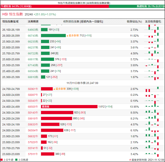街货分布方面,至周四,恒指牛证街货重货区仍在收回价24000点至24500点之间,累计相当约4,594张期指合约;恒指熊证街货重货区仍在收回价25600点至26100点之间,累计相当约1,810张期指合约。