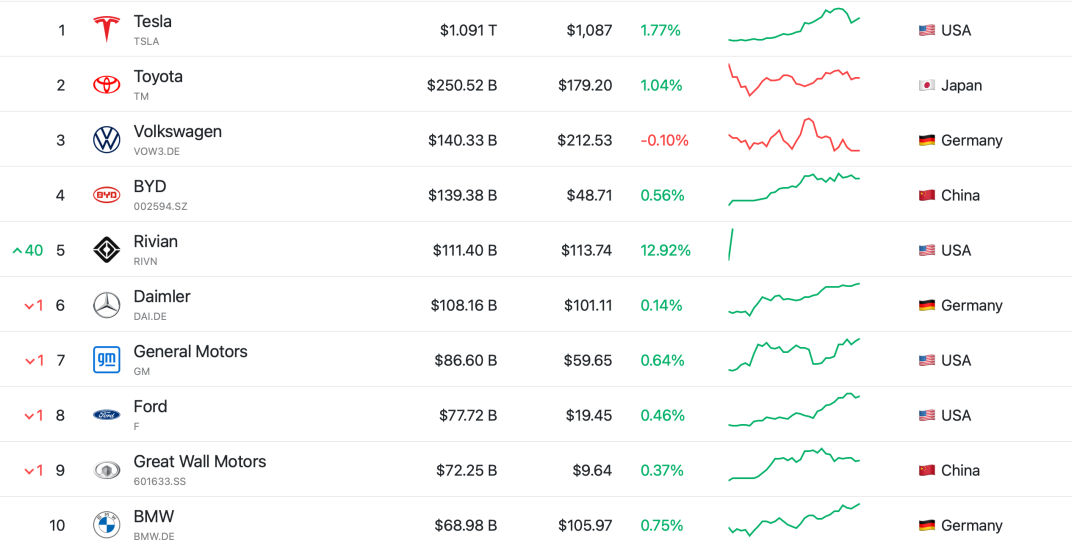 11月11日截至发稿,全球汽车市值发生了新的排名变化。