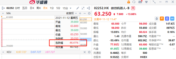 上海微创医疗机器人于11月2日正式以“2252”为证券代码在港交所主板挂牌上市。截至11月12日午盘,微创机器人已累涨逾46%,市值站上600亿港元。