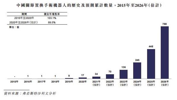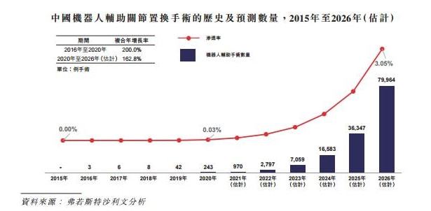 于2016年在中国推出首款关节置换手术机器人后,关节置换手术机器人在中国已逐渐普及。预计近期关节置换手术机器人的数量将迅速攀升。