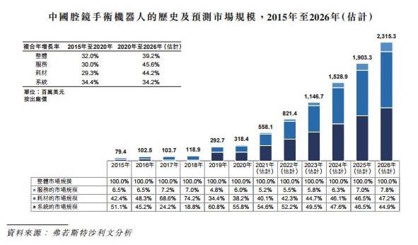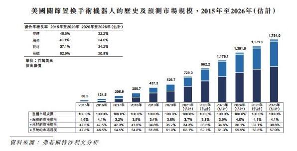从市场规模来看,美国目前是关节置换手术机器人的最大市场。美国关节置换手术机器人的市场规模由2015年的80.5百万美元增至2020年的526.7百万美元,复合年增长率为45.6%,并预期进一步增至2026年的1,754.0百万美元,自2020年起的复合年增长率为22.2%。