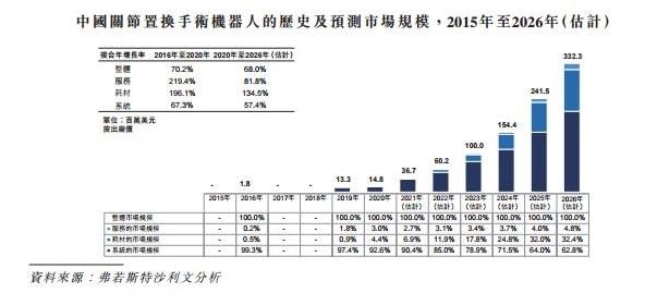 2020年,中国关节置换手术机器人的市场规模为14.8百万美元,由于在近年才被引进中国,故市场规模相对较小。然而,机器人辅助关节置换手术迅速普及,并获广泛接受,且考虑到合资格患者数量众多及应用渗透率较低,故具有强劲的增长潜质。根据弗若斯特沙利文的数据,中国关节置换手术机器人的市场规模预期将于2026年达到332.3百万美元。