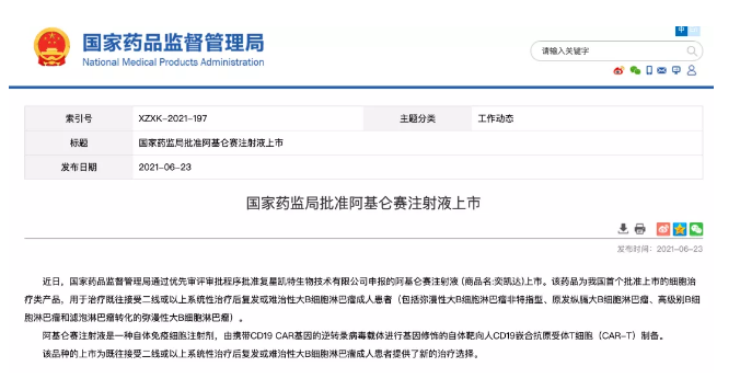 而这款“救命药”就是中国首个获批的CAR-T药物——阿基仑赛注射液(奕凯达),它于今年6月批准上市,为广大癌症患者带来了希望。
