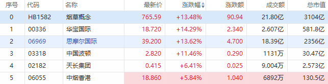 华盛资讯11月12日消息,港股烟草概念午后拉升走高。截至发稿,华宝国际涨14.29%,报18.72港元每股,成交额2.6亿港元;思摩尔国际涨13.62%,股价现报39.2港元,成交额18.39亿港元;中国波顿涨11.46%;天长集团涨6.41%;中烟香港涨5.84%。