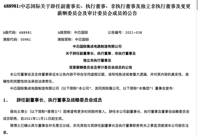 根据公告,蒋尚义因为希望有更多时间陪伴家人,所以自2021年11月11日起,辞任中芯国际副董事长、执行董事及董事会战略委员会成员职务。梁孟松则为了专注于履行作为中芯国际联合首席执行官的职责,自11月11日起辞任执行董事职务,将继续担任中芯国际联合首席执行官。伴随蒋尚义、梁孟松职位调整的还有中芯国际董事会和下属薪酬委员会、审计委员会成员的变更。