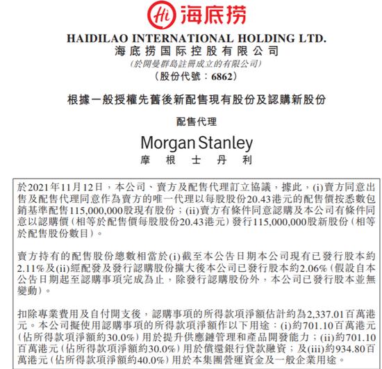 11月12日消息,海底捞发布公告,计划以每股20.43港元配售1.15亿股股份,拟筹资23.37亿港元,约20亿人民币。所得款项30%用于提升供应链管理和产品开发能力;30%用于偿还银行贷款融资;40%用于集团营运资金及一般企业用途。