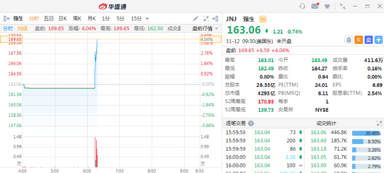 截至发稿,强生盘前涨超4%,报169.65美元。