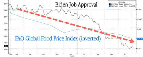 在肉类价格上涨的同时,全球食品价格也创下了10年来的新高。与此同时,美国消费者价格以40年来最快的速度上涨,部分原因是食品价格飙升。飞涨的通货膨胀(食品、能源、住房和车辆)在美国民众中引发了一段时间的不满情绪,这在总统民调数据中就有所体现。