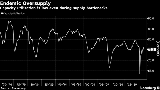 这种情况可能不会像1970年代那样(当时产能利用率几乎达到90%),但是鉴于供应链瓶颈可能持续存在,企业盈利能力下降以及人们对通胀的愤怒可能成为经济更大威胁。