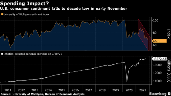 “近期内,短缺和物价应该会抑制通胀调整后的支出水平,”彭博经济学家Eliza Winger在一份研报中表示。“展望未来,风险很大,持续的价格上涨会影响消费者的通胀心态。”