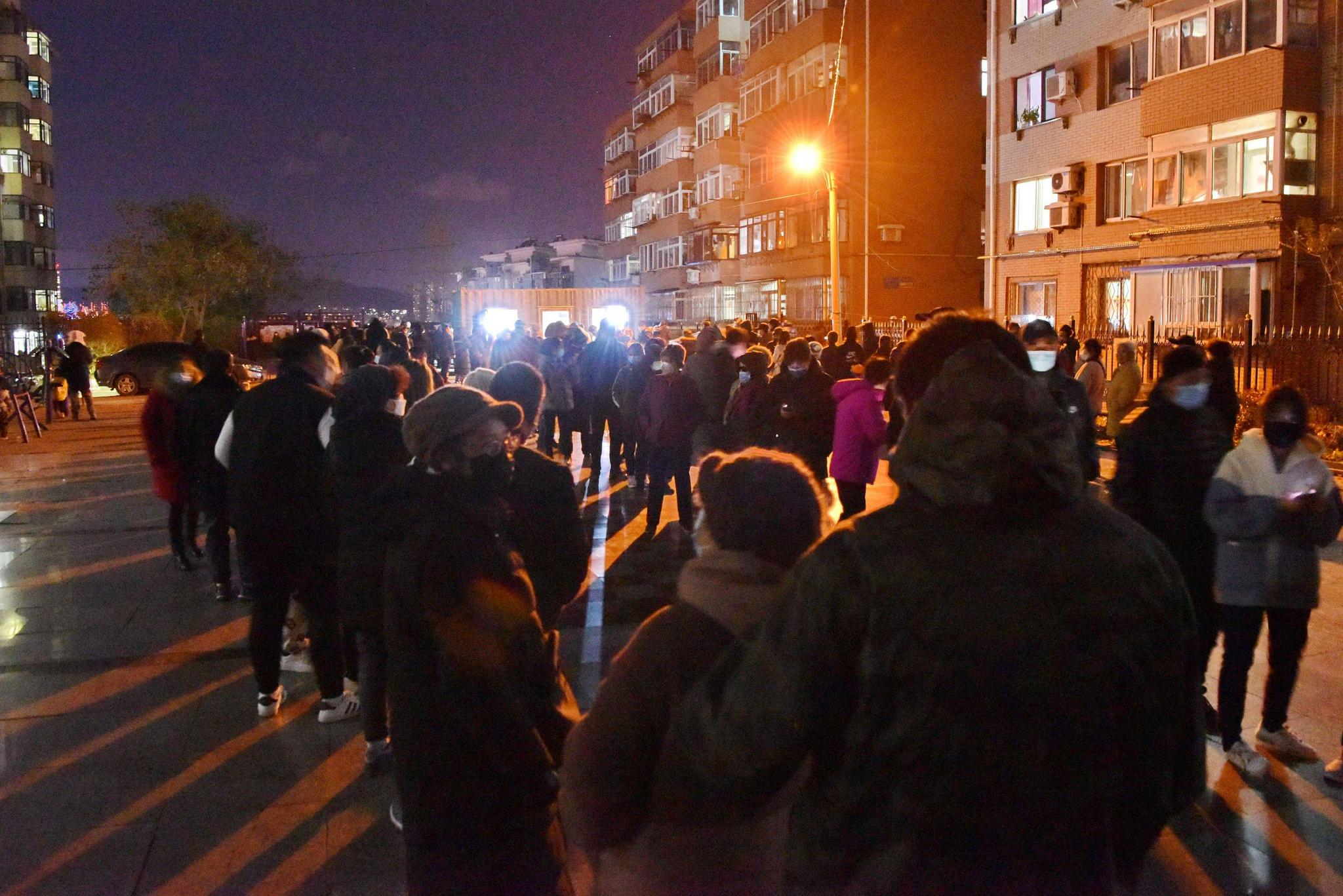 2021年11月11日晚,辽宁大连,沙河口区马栏街道兰园社区的居民在灯光下有序排队进行第二轮核酸检测。