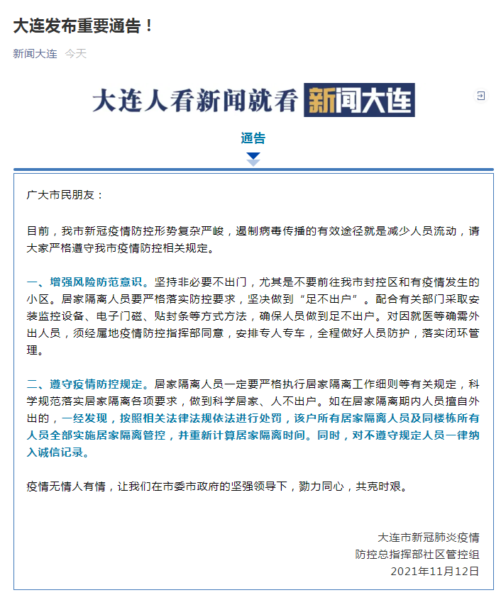 11日,大连疫情防控总指挥部社区管控组也发布通告,告知广大市民,“坚持非必要不出门,尤其是不要前往大连市封控区和有疫情发生的小区。居家隔离人员要严格落实防控要求,坚决做到“足不出户”。