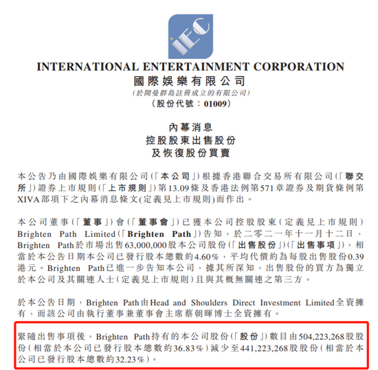 国际娱乐发布公告,公司董事会已获公司控股股东Brighten Path Limited(「 Brighten Path 」)告知 ,11月12日, Brighten Path于市场出售63,000,000股本公司股份(「出售股份」)(「出售事项」),相当于本公告日期本公司已发行股本总数约4.60 %,平均代价约为每股出售股份0.39 港元。