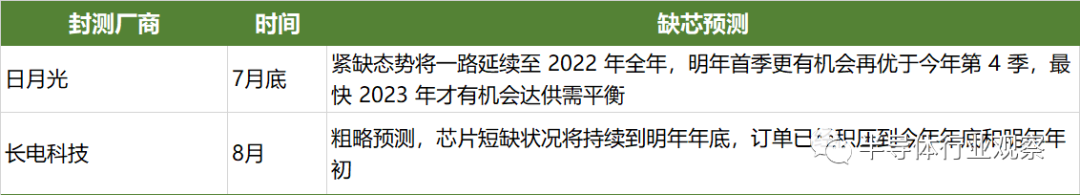 封测龙头日月光的营运长吴田玉7月份表示,目前需求比先前看起来强劲,下半年产能持续供不应求,紧缺态势将一路延续至2022年全年,最快2023年才有机会达到供需平衡。