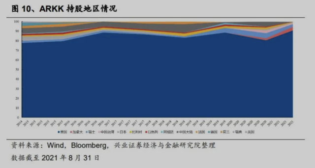 ARKK的持股公司以美国公司为主,中概股的占比曾经高达9%。ARKK历史上对美国公司持股占比一直在80%到90%左右,目前占比最高的三个地区是美国(90.73%)、加拿大(3.89%)、瑞士(2.74%)。历史上,中概股占比在美国以外的国家或地区平均占比最高,在2018年末曾达到9%,ARKK在目前持仓中(截至2021年8月31日)未持有任何中概股。