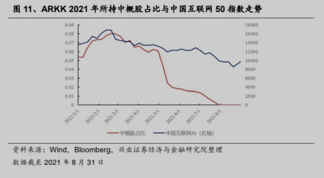 今年以来,ARKK持有的中概股比例在2月份达到最高,随后逐渐降低,在7月底开始占比为0。Wood先后清仓了百度、虎牙、贝壳、腾讯。从中概股占比和中国互联网50指数的走势对比来看,Wood很大程度上规避了中概股在7月来的较大跌幅。