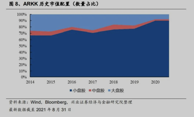 相对于权重占比,ARKK的小盘股数量占比更加呈现绝对优势。2021年最新的大盘、中盘、小盘占比分别为8.16%、2.04%、89.80%。