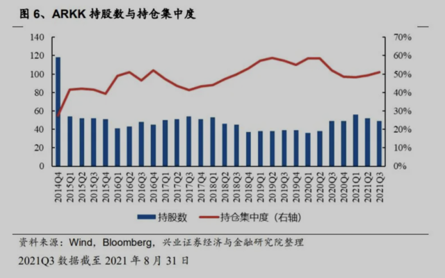 持股集中,持股数量在50只左右,前十大重仓股占比约50%。我们根据每个季度前十大重仓股占股票市值比,计算了基金的持股集中度,ARKK历史集中度中枢48.36%,持股较为集中,从持股数来看,除去2014年Q4持股118只,较为分散以外,15年以来的持股数都在30只到60只之间,历史平均持股数49,持股相对集中。