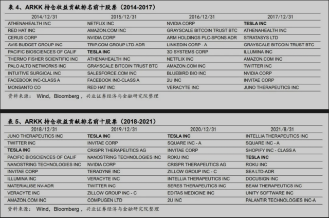下表为ARKK的每年贡献最高的前十大股票列表。可以看到,特斯拉在2015年、2017年~2021年均进入贡献最高的前十大证券列表,并且在2019年和2020年贡献均为第一,其中2020年153%的收益中特斯拉贡献39.63pct,十分显著。